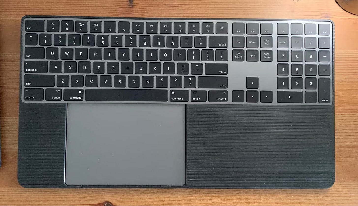 If you're tied to a desktop, there are options. Keyboard trays like the one below give you the laptop form factor, a trackpad right next to the keys, while keeping a full-sized keyboard and a larger trackpad. I'm about to pick one up myself while working on my Mac Mini because it’s really annoying to have to move my hands away from the keyboard. Apple would make a killing if they just sold a keyboard and trackpad that was just the bottom of a 15-inch MacBook Air.